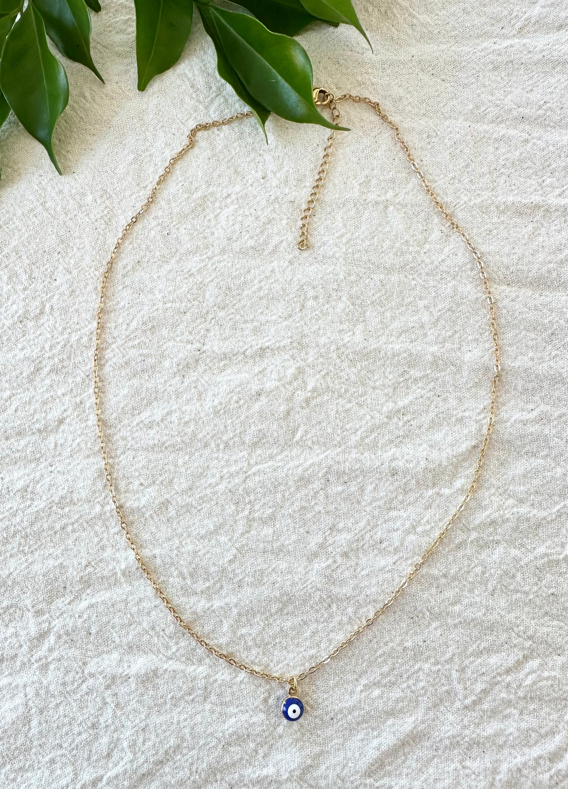 Embrace protection and style with our stunning Evil Eye Necklace. This beautifully crafted piece features a delicate gold chain with a minimalistic blue evil eye charm, symbolising good luck and warding off negativity.